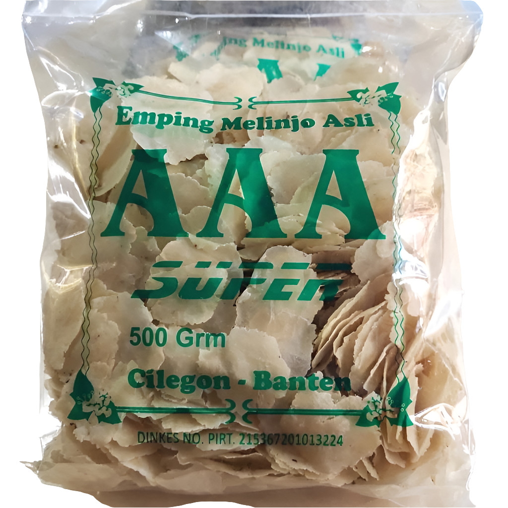 Emping AAA are delicate and crispy Indonesian crackers made from thin slices of melinjo nuts. Their subtly bitter and savory flavor provides a unique taste experience, making them a delightful snack with a slightly sophisticated edge. Fry in hot oil for a few minutes until they bloom and add them to a hot plate of rice and your favourite protein for a satsfying meal! Or you can eat them alone as a snack with a sweet soy sauce dip!